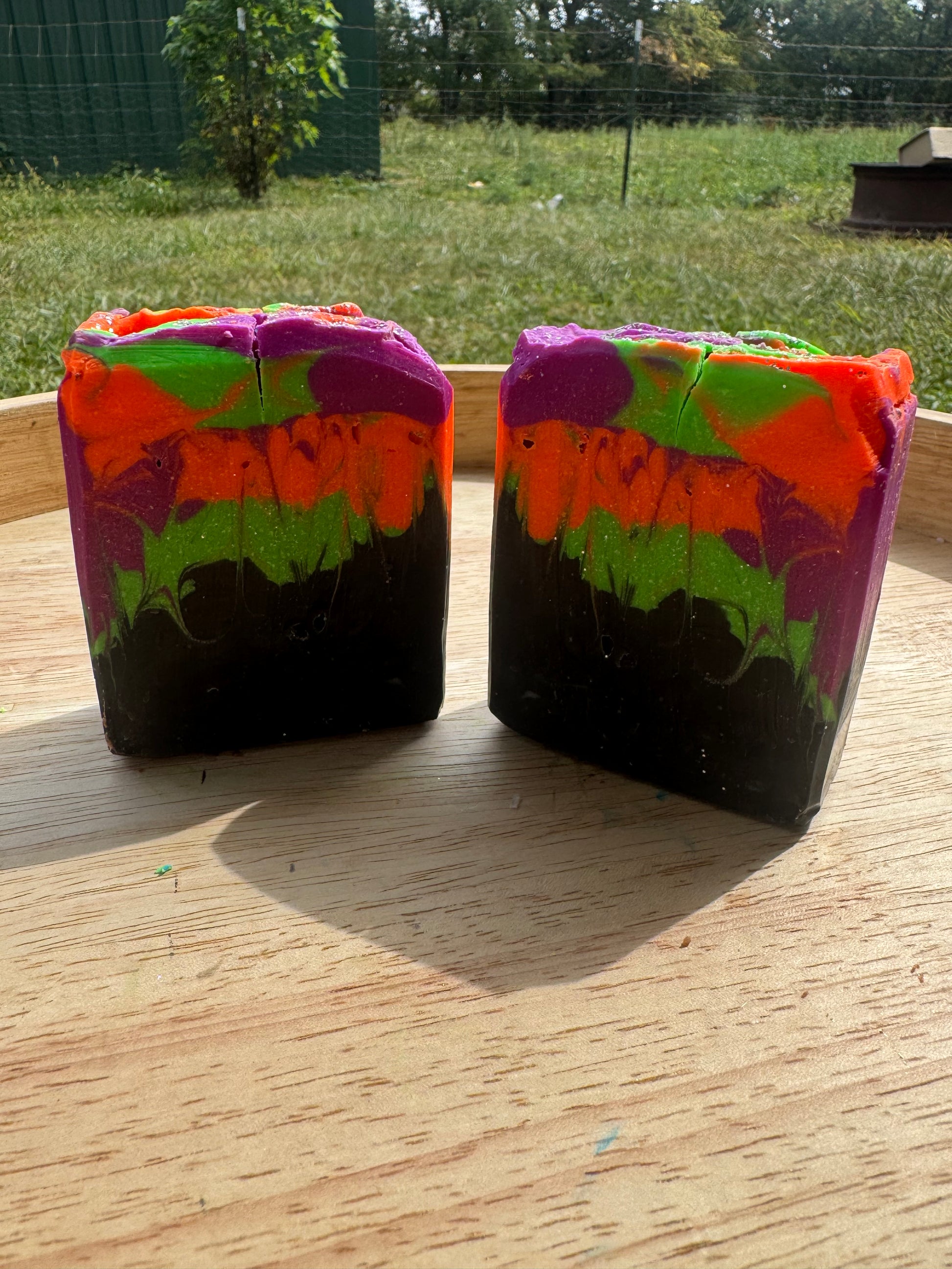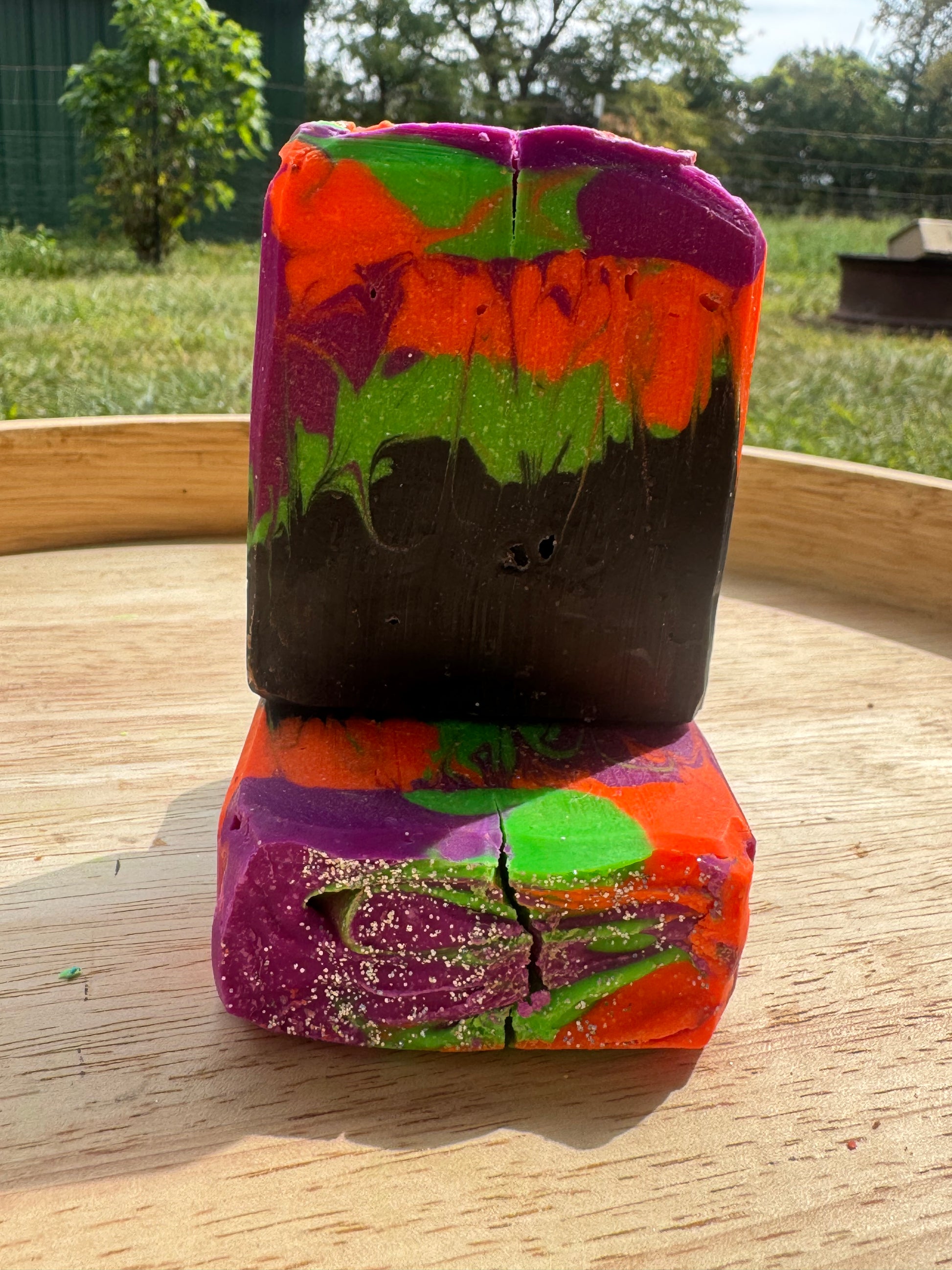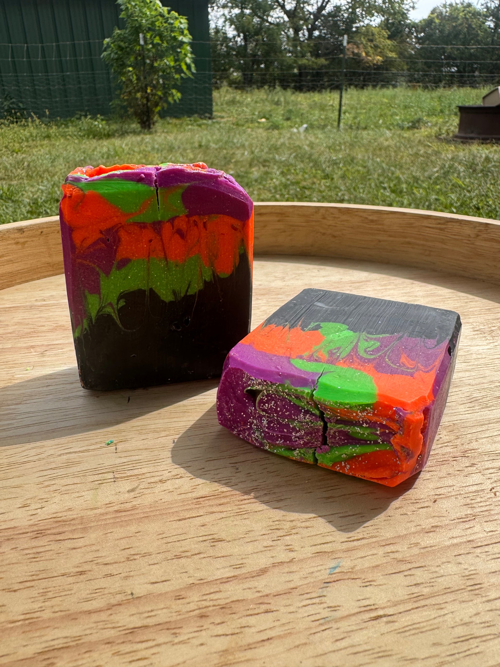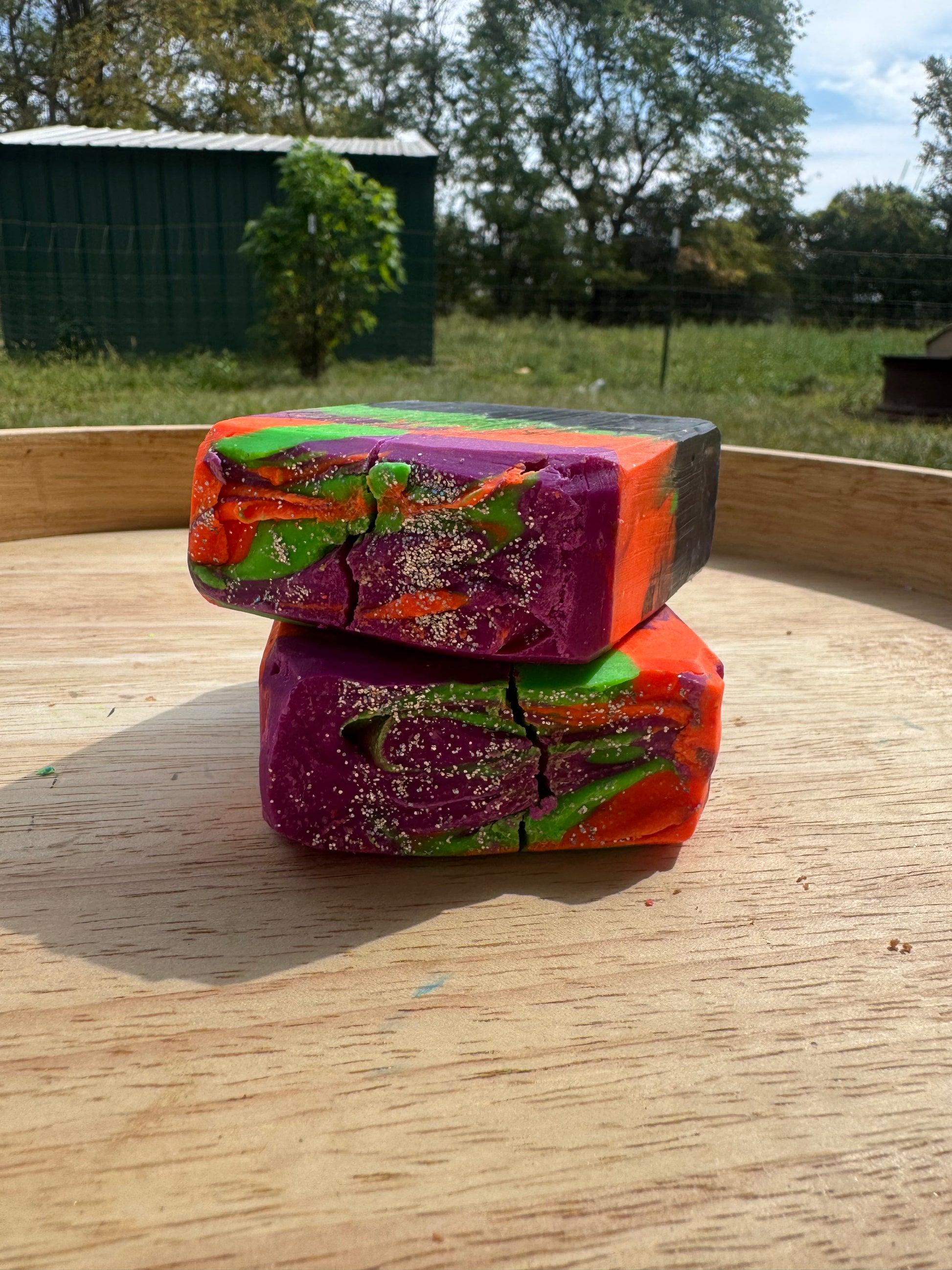 Ingredients: Lard, Saponified oils of Coconut, Olive, and Castor, Sodium Lactate, Powdered Goat Milk, Kaolin Clay, Fragrance Oil, Mica, Biodegradable glitter.