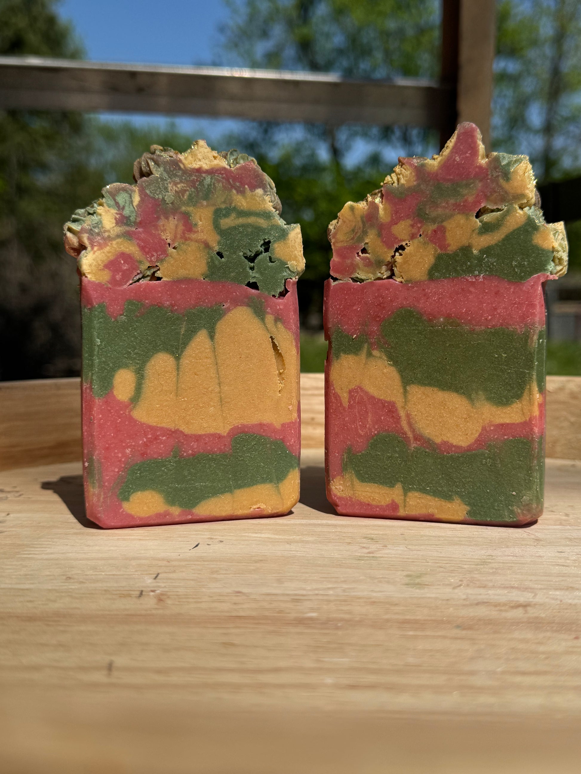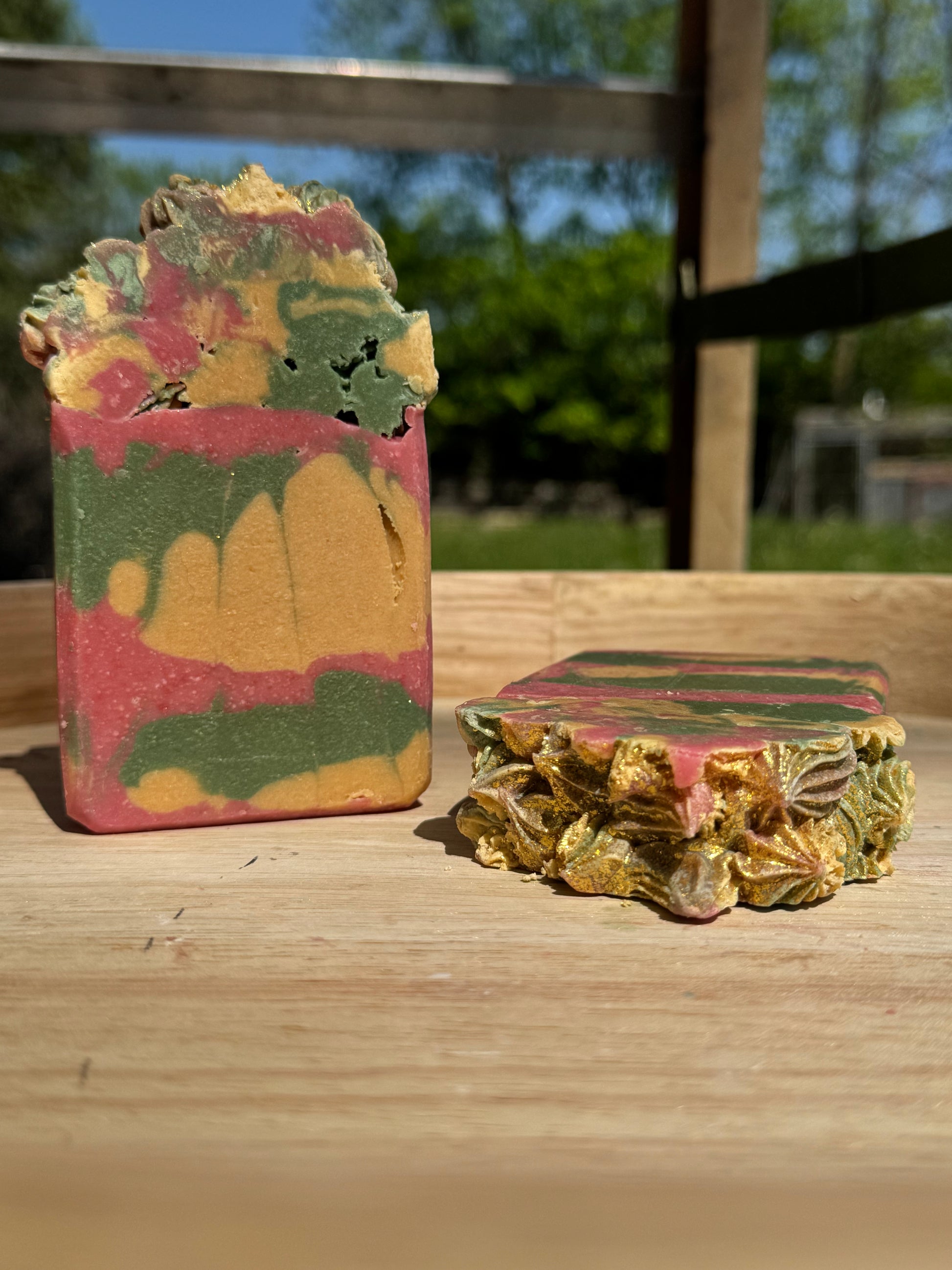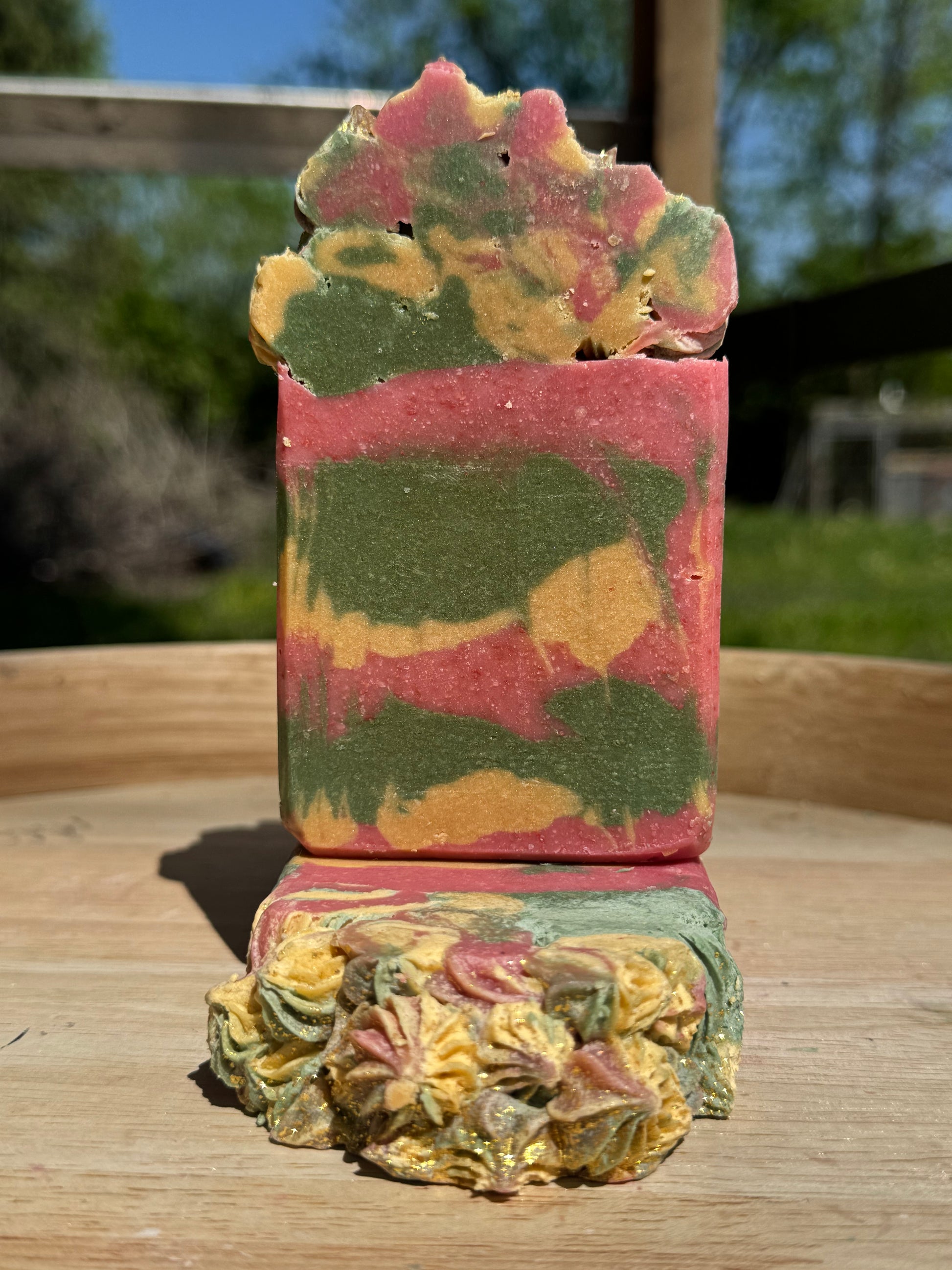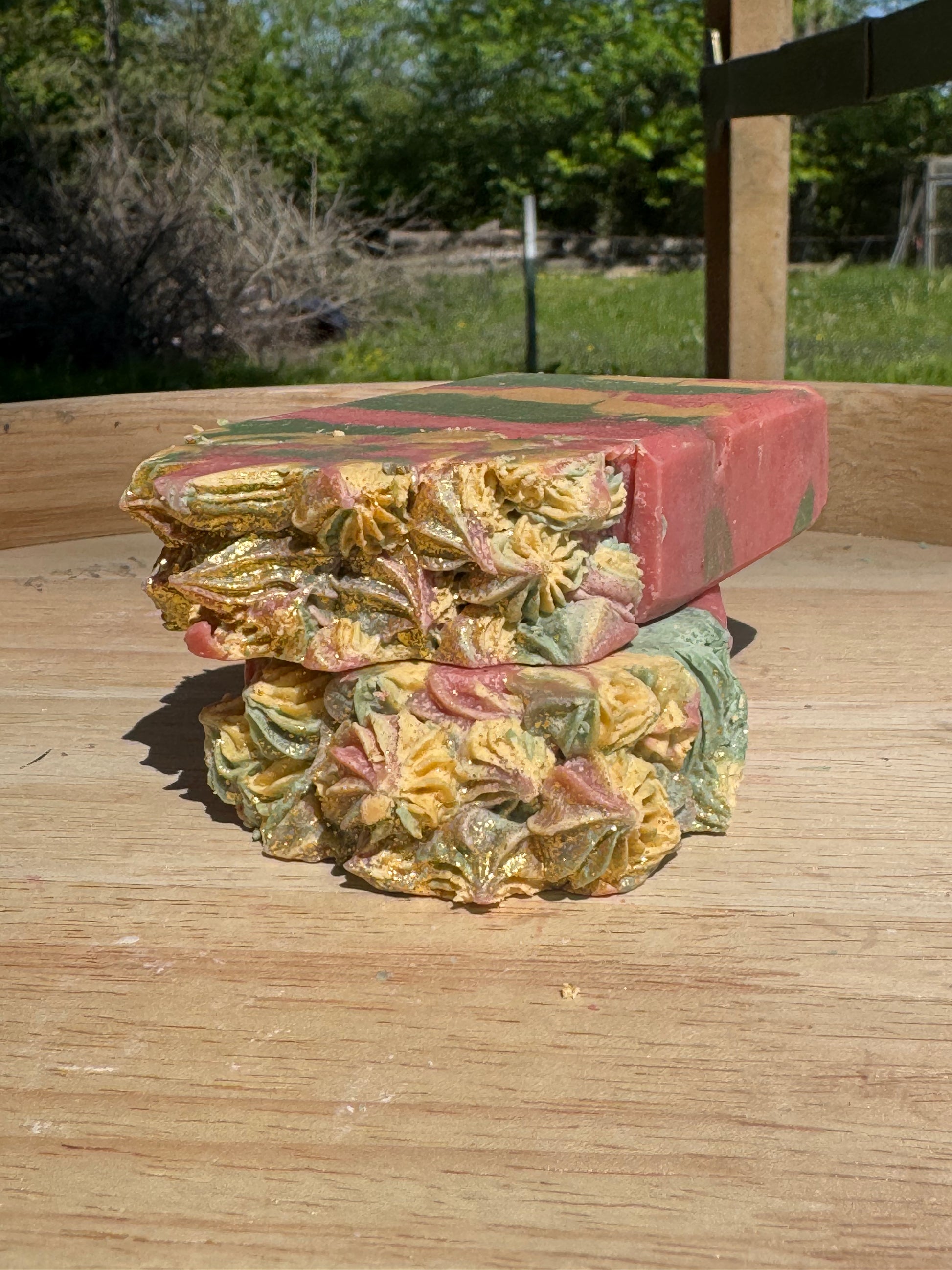 Ingredients: Saponified oils of Coconut, Lard, Tallow, Canola, Castor, Jojoba, Kokum butter. Powdered Goat Milk, Sodium Lactate, Mica, Honey, Phthalate Free Fragrance Oil.