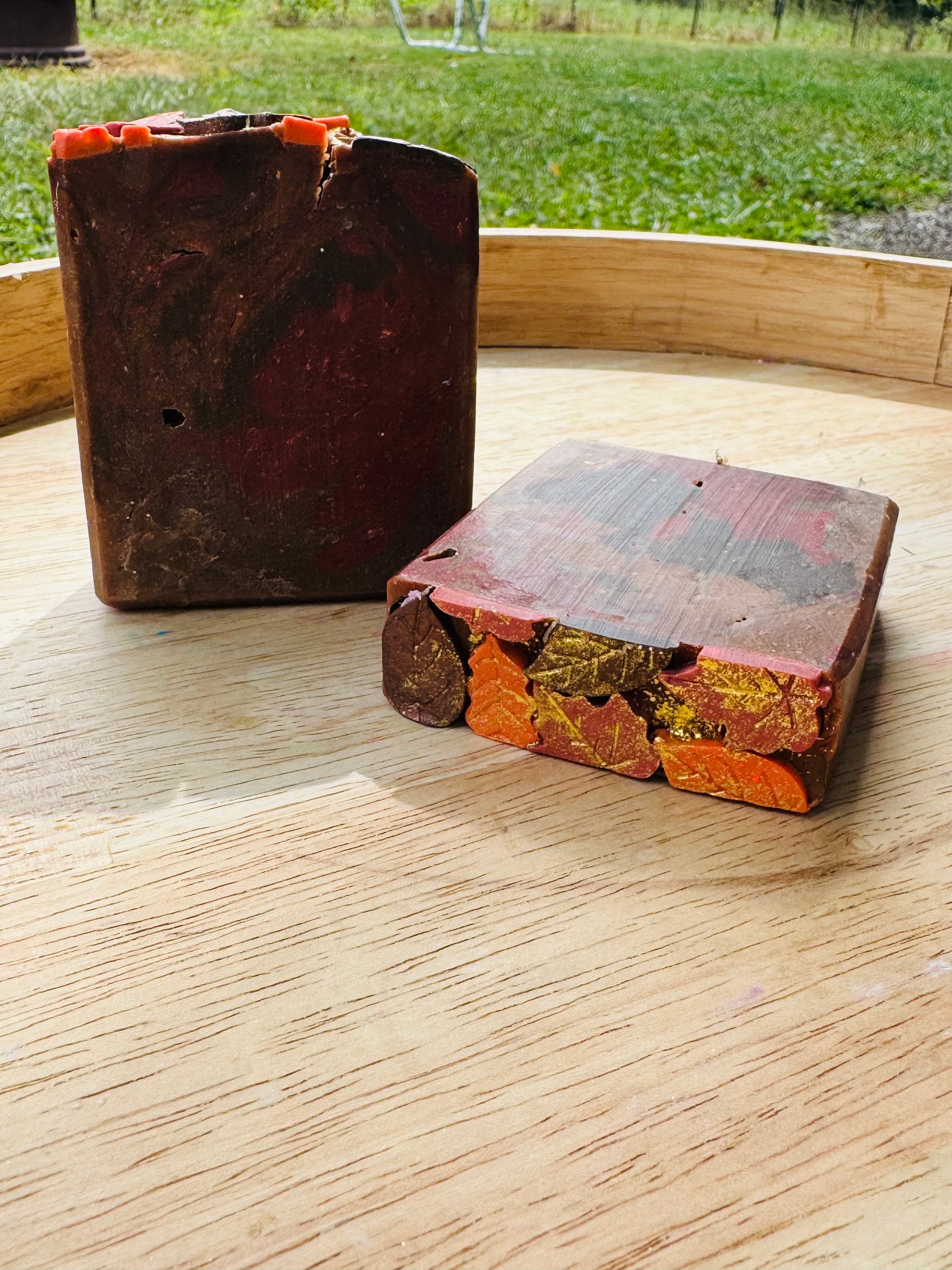 This soap is the epitome of fall. Fall colors swirl together and are topped with gold glitter and adorable leaf embeds. Scented with a dupe for BBW Fireside!